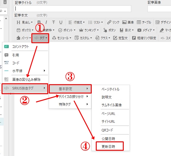 @記事を作成するページの上部メニューから</タグ>を選択します。