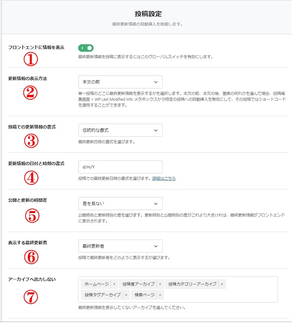 D「公開と更新の時間差」:もし、公開したあと、修正するような場合があるときには、何回も更新日が変更されないように、更新表示する時間を指定することが出来ます